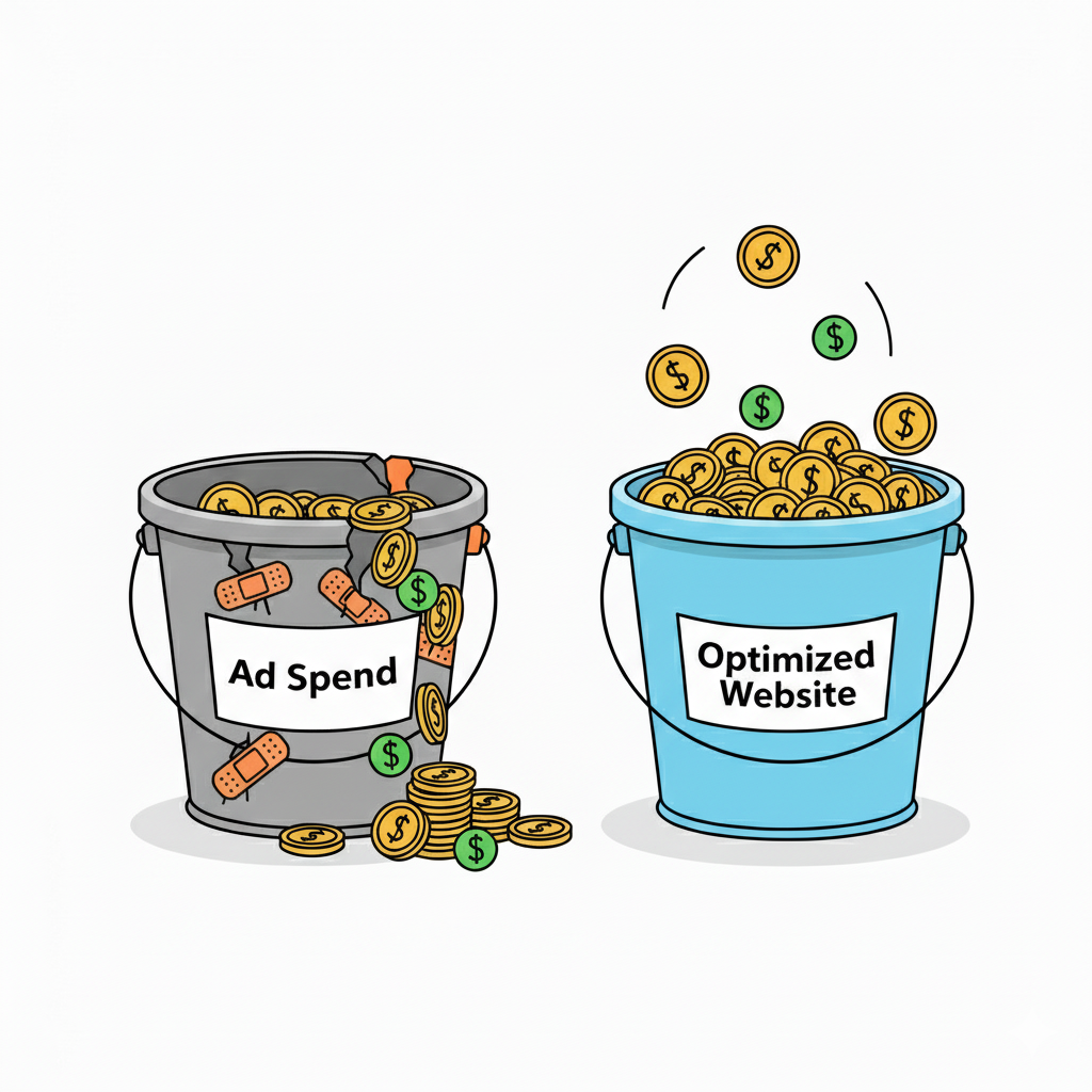 Your ads bring the water. Your website is the bucket. If the bucket leaks, you waste money.
